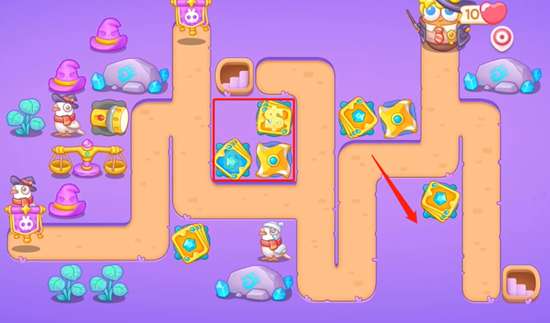 2、打掉道具之后,我们在魔法阵上面继续放置卡牌,增加前面的清线能力,然后使用后面的炮台清理右边的道具。