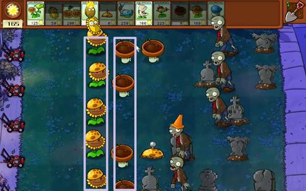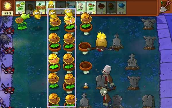 2、开局优先建造阳光向日葵,输出炮塔使用小盆菇和土豆雷,小盆菇越多越好。