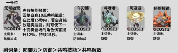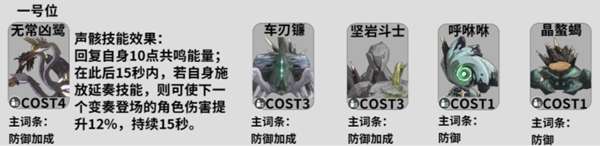 一号位:无常凶鹜,其技能效果是回复自身10点共鸣能量;在此后15秒内,若自身施放延奏技能,则可使下一个变奏登场的角色伤害提升12%,持续15秒,主词条选择防御加成。