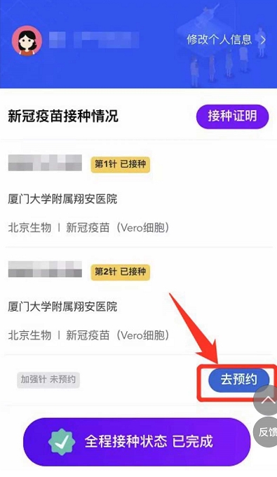 5、接着系统会显示你的接种情况,在下面有个【加强针】,点按【去预约】。