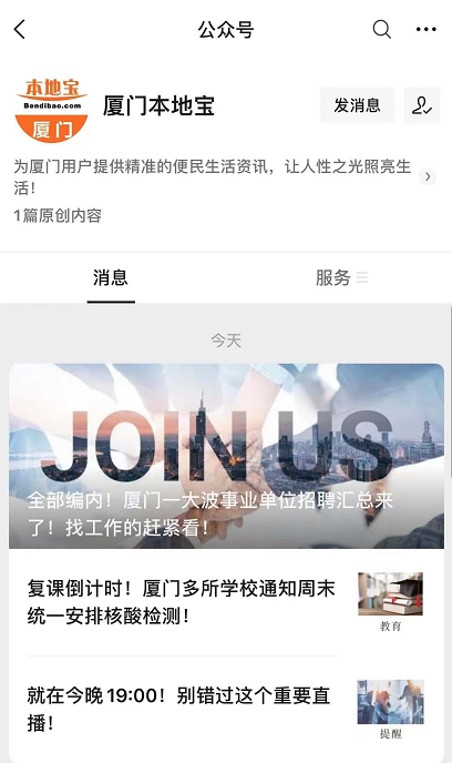 1、首先打开微信,搜索“厦门本地宝”关注其公众号。