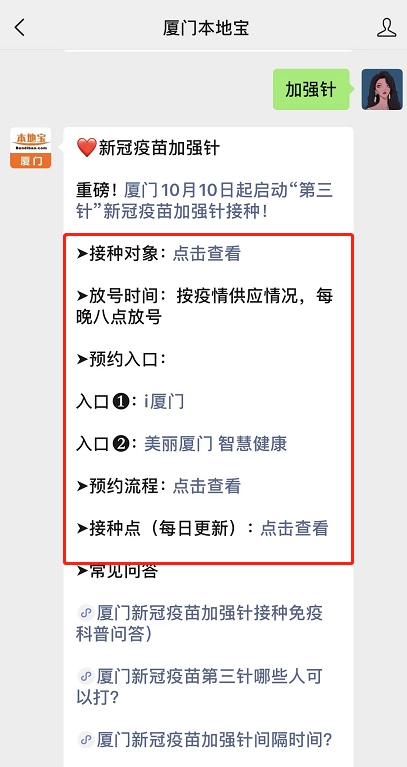 2、在对话框中输入【加强针】或者【第三针】就会出现预约入口,点击进入。