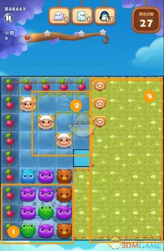 1、第一步:三消引爆樱桃炸弹,采用贴边三消等方式送咩咩羊进入羊圈。