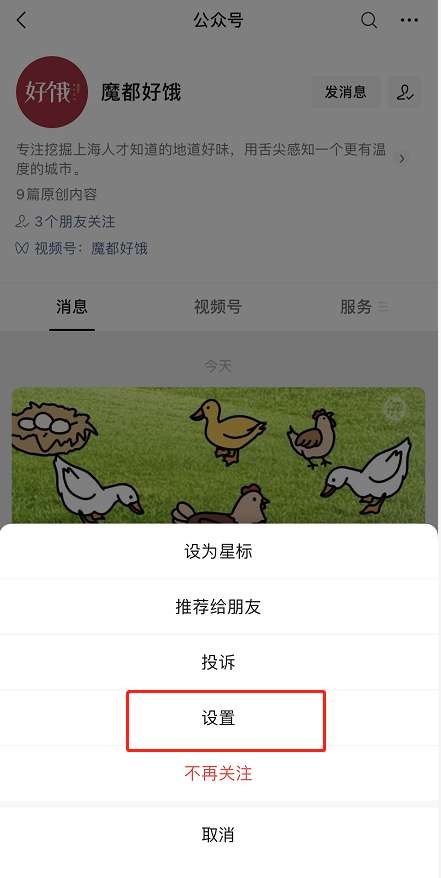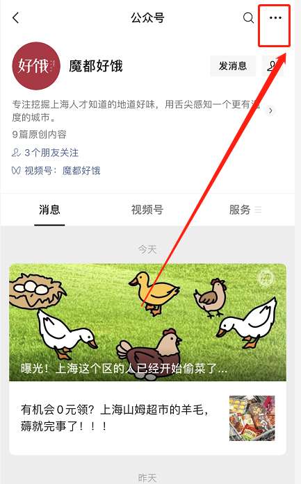 1、将微信更新至最新板块,然后点击进入想要关闭的公众号主页,点击上方【...】