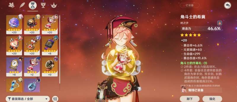 圣遗物的选择可以先从套装类型开始,烟绯作为比较标准的输出角色,可以选择的类型有很多。在游戏初期,可以使用流浪大地的乐团这套五星圣遗物作为过渡,2件套的精通属性可以用上,关键是4件套增加角色重击伤害非常适合烟绯的输出模式。而且这套圣遗物在刷本或者过主线的时候都会送不少,所以凑出合适的套装还是很容易的。到了中期想要进一步追求烟绯的伤害的话,玩家还可以选择炎之魔女套装,这也是最适合火属性角色的五星圣遗物类型,大量的火元素伤害加成可以提升烟绯不少的伤害。只不过刷到合适的圣遗物还是需要不少时间和体力的。然后如果充能足够的话,追忆套也是非常适合烟绯的五星套装,它的攻击力加成以及普攻重击加成能完美适配烟绯的输出模式。