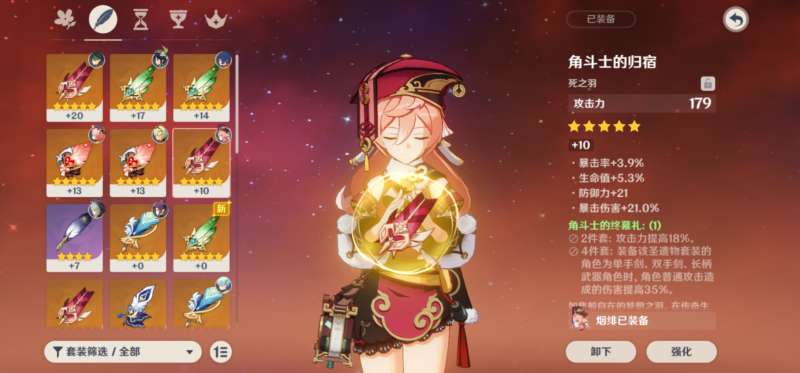 五星圣遗物除了套装类型外,还要选择合适的词条。烟绯是比较标准的双爆攻击目标,所以词条选择上也以攻击力、暴击和爆伤为主。一般花和羽毛都是固定的属性,所以只要看合适的副词条就可以。杯子适合用火属性伤害加成的火伤杯,沙漏的话可以根据队伍类型选择,打反应的话就用元素精通的沙漏,纯火直伤的话就用攻击力沙漏,。头冠肯定是一暴击为主,可以根据暴击和爆伤的比例来确定主词条的选择,一般其他圣遗物暴击高就选爆伤冠,爆伤多的话就用暴击冠。