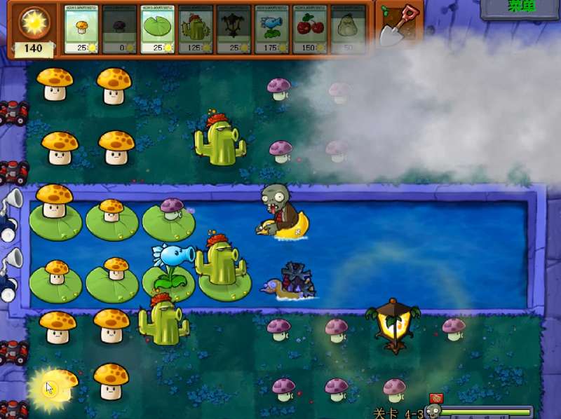 这一关里布局也要进行合理布置,这样才能更好应对越来越多的僵尸。游戏初期的首要任务是尽快种植足够多的向日葵以保证阳光供应,同时需要在僵尸接近家里之前布下最基本的攻击植物。而且每一路至少有一个的寒冰射手和一个起到防御作用的坚果墙。这样前期的小部分僵尸就可以轻松应对了。注意当气球僵尸出现时,可以使用三叶草进行反击。不过风扇草的冷却时间较长,为了最大化这个植物的作用,建议在僵尸出现之后不着急使用,可以等后面出现更多气球僵尸之后一起把它们吹跑。等后面太阳多起来了之后,玩家可以在泳池里多种一些猫尾蒲,因为泳池的僵尸攻势或弱一些,猫尾蒲火力足够的时候还可以支援到其他路线上。随着游戏的进行,根据僵尸波的情况逐步增加攻击植物,同时在关键位置预留位置放置倭瓜和樱桃炸弹应急。游戏后期僵尸的数量较大,确保有足够的空间放置用于应急的植物,不然可能会导致樱桃炸弹没地方种。