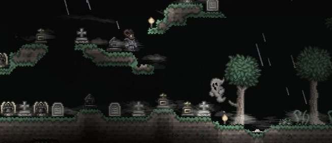 灵雾只会出现在固体物块上方的一定范围内,有时也会有小缕出现在空中,放置越多墓碑,灵雾就会越厚,背景也会越暗。灵雾与制作站结合可以用于制作特殊物品,玩家不需要直接接触灵雾,只需处于墓地就可以制作。