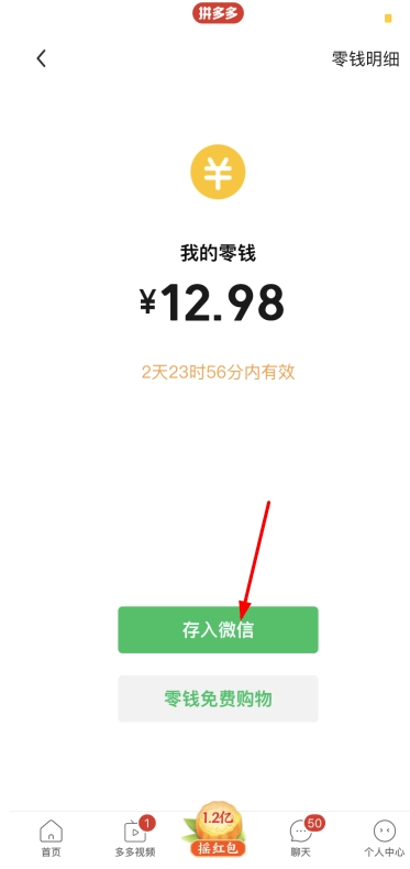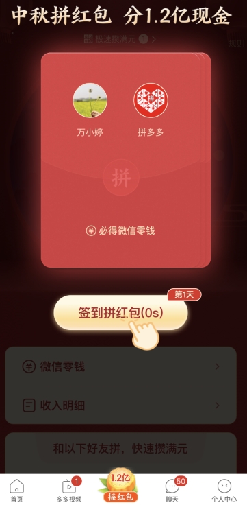 1,打开拼多多APP,在首页的底部位就很明显的看到了摇红包瓜分1.2亿的字眼,点击进入;