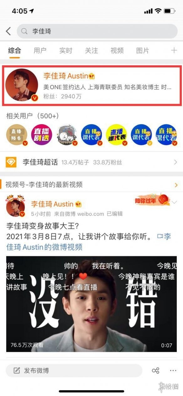 3、微博搜索李佳琦,关注李佳琦账号,每晚开播都会有链接,可以点击直接观看。