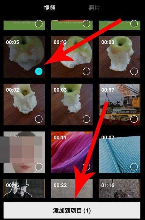 3、打开照片/视频界面点选视频素材,然后点击“添加到项目”。注意,必须要点选至少1个素材,可以同时添加多个素材(如图所示)。