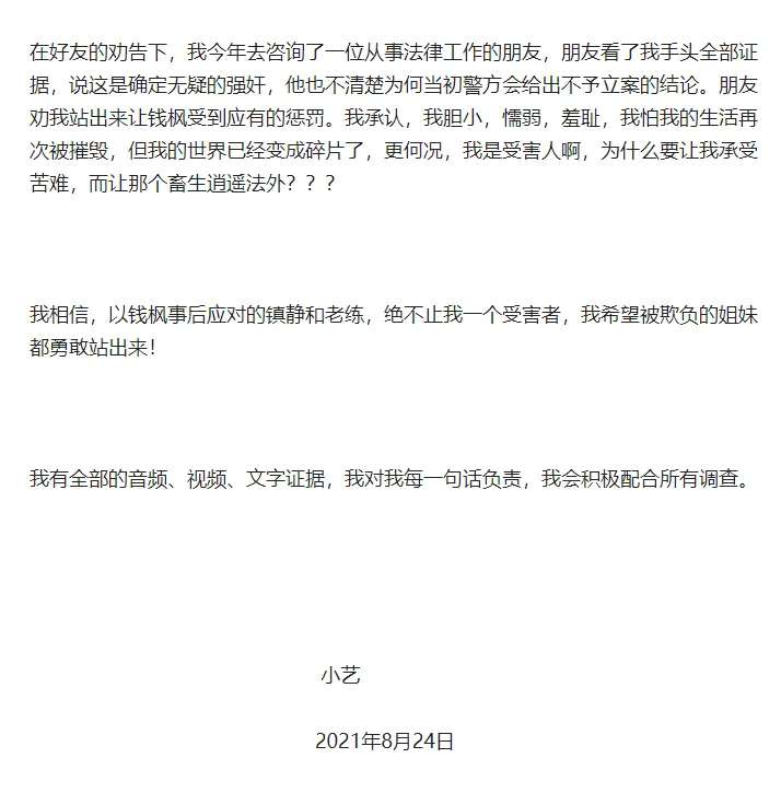 八月二十四日,一位名叫小艺的网友在网上发长文称,2018年曾遭到钱枫性侵。小艺还贴出了当年两人的聊天记录,以及相关的视频,音频。