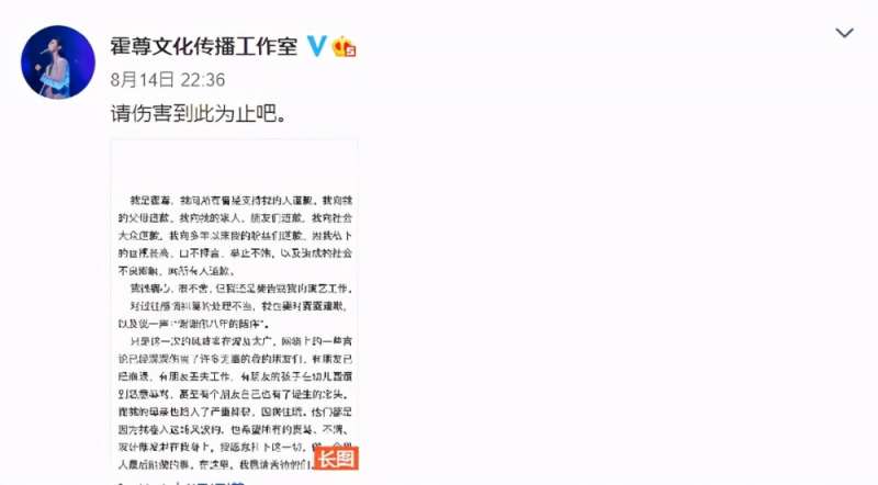霍尊被推上了舆论的风口浪尖。面对汹涌的舆论,霍尊先是发了一个不痛不痒的回应,但没什么效果。。8月14日晚,他再次回应并且宣布退圈,霍尊在自己工作室的社交账号上发布了一篇长文,他回忆了和陈露的恩爱过往,他否认了陈露对自己的指控,并称不知道300万是怎么回事。