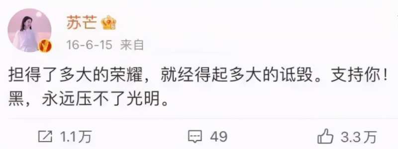 苏芒则隐晦地支持了W姓男星,她发文说:“担得了多大的荣耀,就经得起多大的诋毁。支持你!黑,永远压不了光明。”