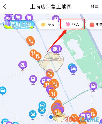 3、就可以看到上海店铺复工地图全景,选择相应的服务,可以查看到该类型已复工的店铺。