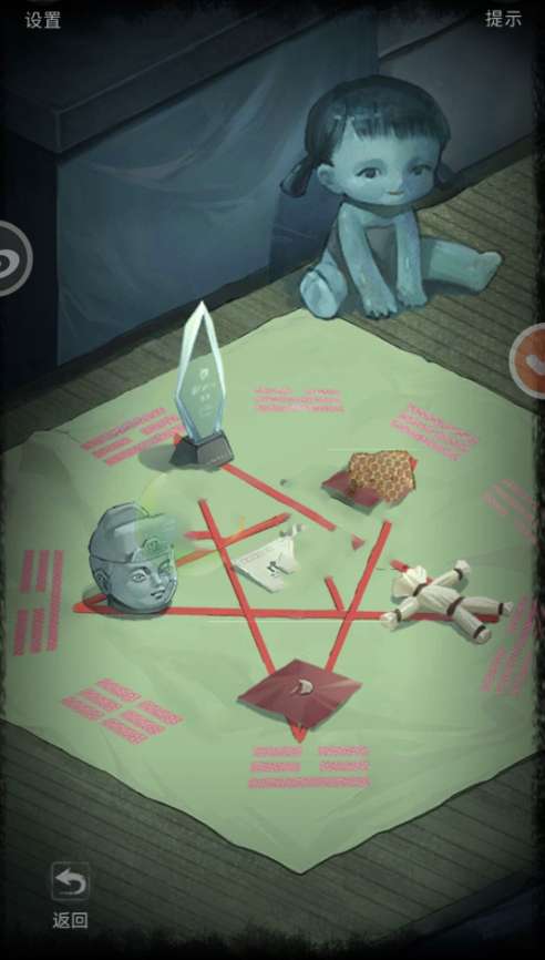 6.拉开房间里侧床上的床帘,观察墙上的涂鸦,解开旁边桌子上的五角星密码(这个地方我是看广告的,看不太懂它的顺序是从哪里得出的)“左,右,左下,中间,右下,上”,得到录像带和缝纫机。用钥匙打开房间外侧右边电视机下面的柜子,放入录像带,到房间里侧桌子上拿小鱼刺绣给爸爸。过完剧情点返回。