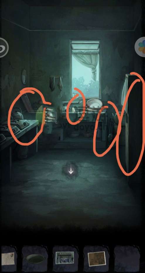 3.柜子旁火炉边得到煤钳,中间水池里得到丝瓜瓢。厨房左侧煤气炉放上铁锅,点击水壶倒水,用火柴盒点击炉子下方烧水,用玻璃瓶点击水面,放入丝瓜瓢,得到蘸满白醋的丝瓜瓢。用它擦除柜子第二格盘子下面,得到密码“开门七件事”即“柴米油盐酱醋茶”,按照笔画顺序依次点击柜子下方(止匕木米氵由土卜皿丬夕酉酉昔艹人朩),得到面粉。再次点击煤气炉,倒水,点火,放入面粉,用筷子粘上浆糊。