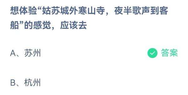 2022支付宝蚂蚁庄园8月5日的题目为:想体验姑苏城外寒山寺夜半歌声到客船的感觉应该去?苏州还是杭州?很多小伙伴可能还不太清楚正确答案是什么。下面小编就为大家带来了正确答案分享,感兴趣的小伙伴们快一起来看看吧!