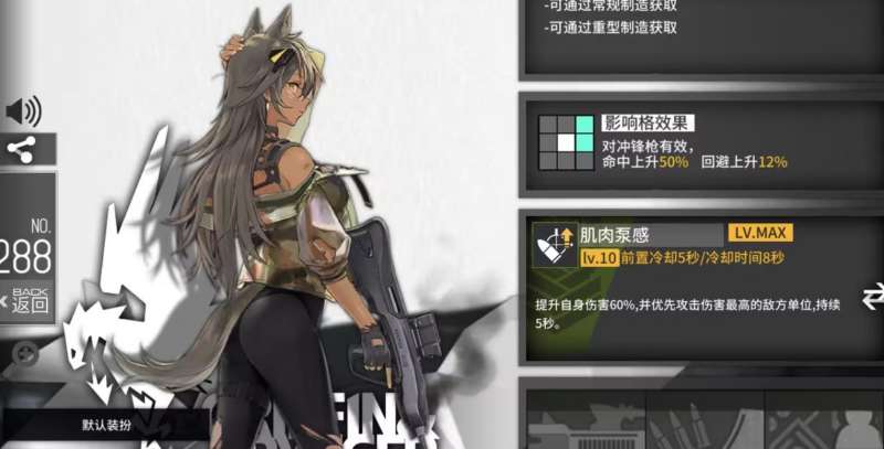 cr21会影响前一排偏上与正前方的冲锋枪,让其回避属性增加百分之十二,让其命中效果增加百分之五十。其技能名叫肌肉泵感,在一级的时候前置时间为五秒钟,冷却时间为十秒钟。将技能升到十级以后,前置时间依旧是五秒钟,冷却会减少两秒钟,变为八秒钟。该技能的效果是提升自己百分之三十至六十的伤害,并优先攻击对面攻击力最高的单位,持续时间会从初始的三秒钟升到五秒钟。