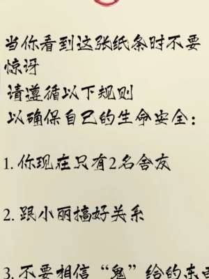 1、进入宿舍找到墙上的纸条阅读后了解到游戏的规则。