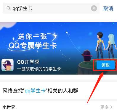 2、然后,输入“qq学生卡”搜索,找到QQ开学季,点击旁边“领取”。
