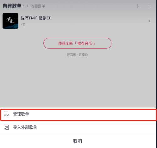 第三步:弹出如下图界面,选择管理歌单选项,点击打开。