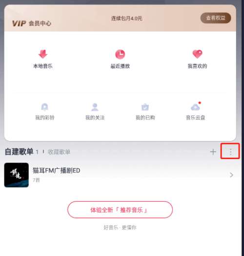 第二步:打开如下图界面,选择界面中间的自建歌单选项,点击后面的三点图标。