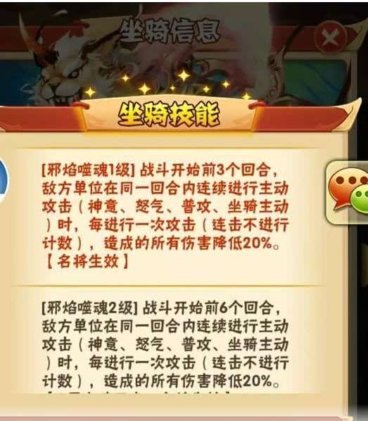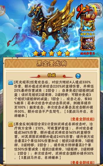 黑金战马也是个实力强大的战马,全称叫做黑金墨龙驹,主动技能可以对四个敌人造成三倍伤害,这是一个群体伤害技能且伤害巨高。还会对敌方额外造成当前骑乘武将直接伤害值的双倍伤害,并且降低二成敌人对我方武将造成的最终伤害(持续两回合)。黑金战马使用过攻击技能后,还有百分之八十的机率可以连击,若是敌人被战马攻击后杀掉了,那么这个连击机率就会提升至百分之百,造成二次高额攻击。