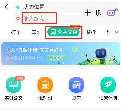 2、输入起点和终点,选择公共交通的出行方式。