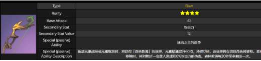施放元素战技或元素爆发时,将获得「森林教诲」的效果,元素精通提升60点,持续12秒。该效果将在切换角色时移除。森林教诲的持续时间结束或被移除时,将对附近一名敌人造成100%攻击力的伤害。森林教诲每20秒至多触发一次。