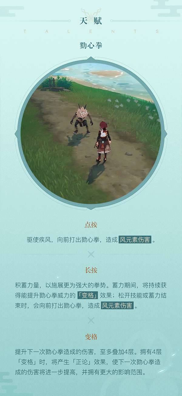 元素爆发「聚风蹴」踢出的「不动流●真空弹」在命中时能够产生「缉拿风穴」,在牵引附近敌人的同时造成风元素伤害。对处于水/火/冰/雷元素附着下的敌人,还会造成相应的追加元素伤害。