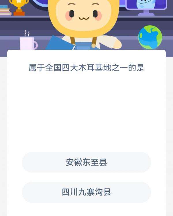 2022支付宝蚂蚁新村7月5日的题目为:属于全国四大木耳基地之一的是?安徽东至县还是四川九寨沟县呢?可能还有很多小伙伴都不太清楚。下面小编就为大家带来了正确答案分享,希望能帮助到你。
