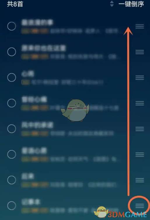 3、选择想置顶的歌曲,点击右侧三横线,进行拖动。