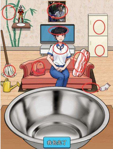 1、包粽子帮她包好大粽子这一关需要拖动下图所示的物品到盆里,注意第一个拖动竹子