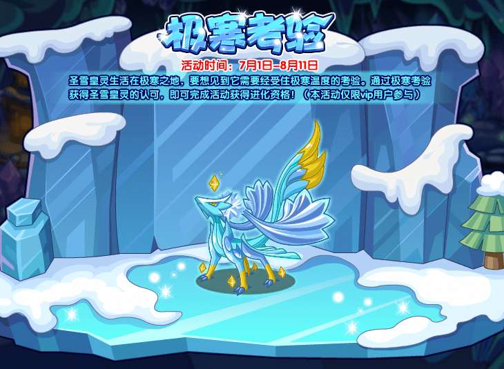 圣雪皇灵生活在极寒之地,要想见到它需要经受住极寒温度的考验。通过极寒考验获得圣雪皇灵的认可,即可完成活动获得进化资格!(本活动仅限vip用户参与)