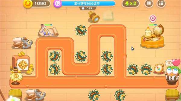 1.点击下方旋转的按钮,选择多重箭,在道路下方空出的位置建顶级多重箭,锁定钱袋,利用多重箭的特性打掉附近的障碍物,随即将右边的大钱箱清除,这两个道具钱是比较多的,优先把这两个清理掉。