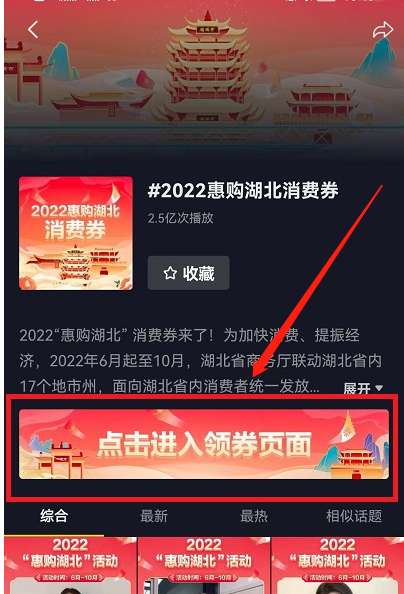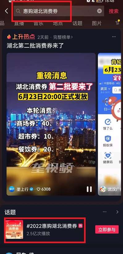 1、打开抖音点击右上角搜索“惠购湖北消费券”,下方可以看到话题入口,点击进入。