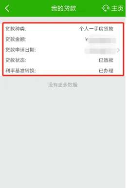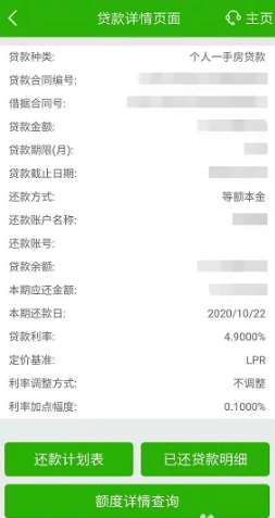 5、点击该贷款界面,可进入贷款详情页面,通过该界面可详细了解贷款合同编号,贷款金额,贷款期限,还款方式,贷款余额等信息。