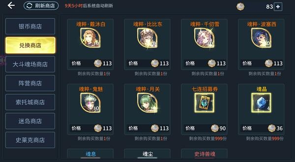 银币商店是平民玩家们主要接触的商店,不过其内设置的物品道具很少,只有三样,主要是领取每天的免费体力,魂息和魂晶在前期可以适当购买一些。