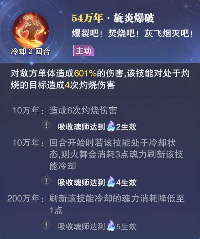 最后火舞真身光环的效果是可以追加普攻,这个追加的普攻倒是可以进一步来触发【灼烧】伤害,另外这个200万年的效果其实非常优秀,例如【火棘】增伤、【火舞耀阳】的增伤靠这个200万年的效果都应该可以持续全场,不过以目前我们的魂环条件来分析,200万年就是一个天文数字,暂时不用想......