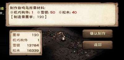 2、自鸣鸟制作材料:机巧构建1个,雪银50个,松木40个,还需要制作需要的墨学120点。