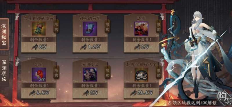 天魔归来活动商店中有深渊秘宝和深渊祭坛两个部分,其中包含了许多基础的式神素材、达摩、活动限定头像框、铃鹿御前全新皮肤御海临渊等丰厚奖励。