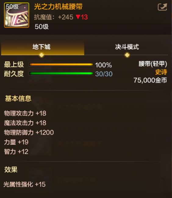 1.装备介绍 「光之力机械腰带」 Lv.50 轻甲 - 史诗 - 腰带 获取方式:制作、委托、深渊派对、道具 2.属性效果 【基本信息】 抗魔值:+245 物理防御力 +1200 物理攻击力+18 魔法攻击力+18 力量+19 智力+12 【效果】 ① 光属性强化+15