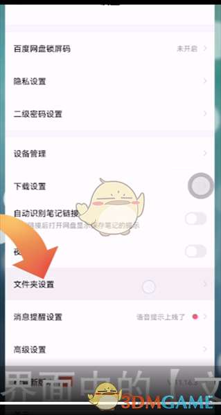 3、进入到设置界面后,找到并点击界面中的【文件夹设置】,将【显示隐藏空间】打开。