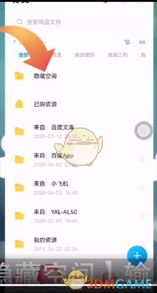 4、退回到我的界面,点击界面底端的【文件】,点击【隐藏空间】输入密码后即可使用隐藏空间。