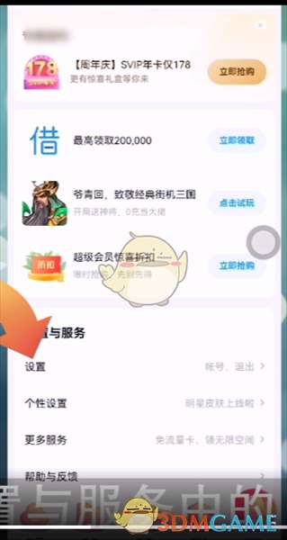 2、向上滑动我的界面至底端,点击设置与服务中的【设置】。