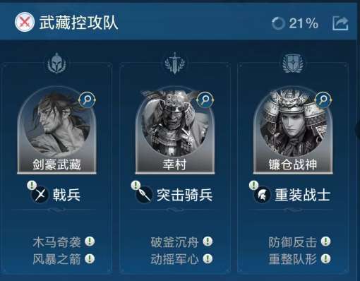 兵种搭配:镰仓战神搭配防御型兵种,武藏搭配攻击型兵种,幸村比较自由,可以搭配辅助兵种,也可以搭配攻击兵种。