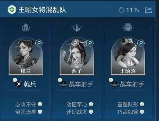 兵种搭配:穆兰输出为主,搭配攻击型兵种,西子与王昭昭主混乱控制,搭配防御型兵种,活着就有收益。