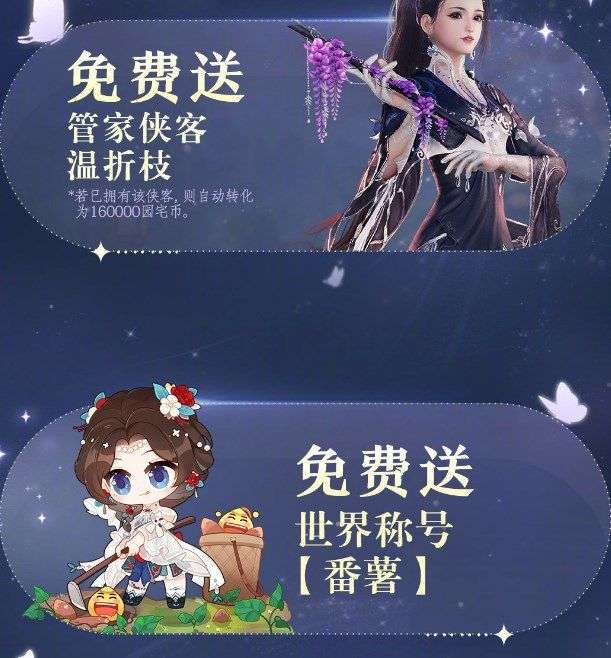 免费送两套定制蓝图家具、管家侠客与番薯称号。