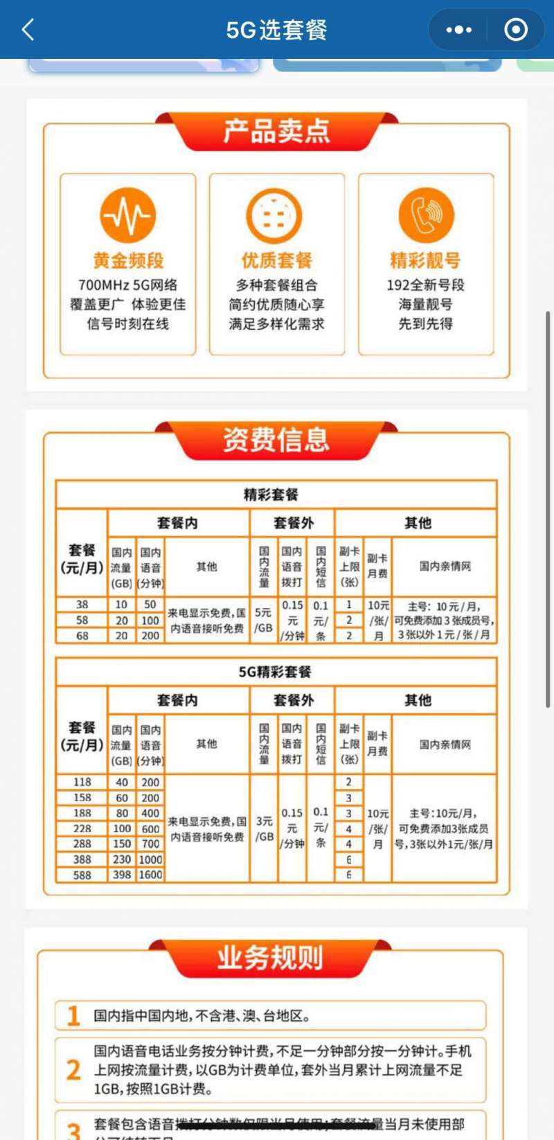 38 元套餐,套餐内国内流量 10GB,国内语音通话 50 分钟,来电显示免费,国内语音接听免费,套餐外国内流量 5 元 / GB,国内语音拨打 0.15 元 / 分钟,国内短信 0.1 元 / 条。副卡上限 1 张,月费 10 元 / 张 / 月。主号 10 元 / 月,可免费添加 3 张成员号,3 张以外 1 元 / 张 / 月。